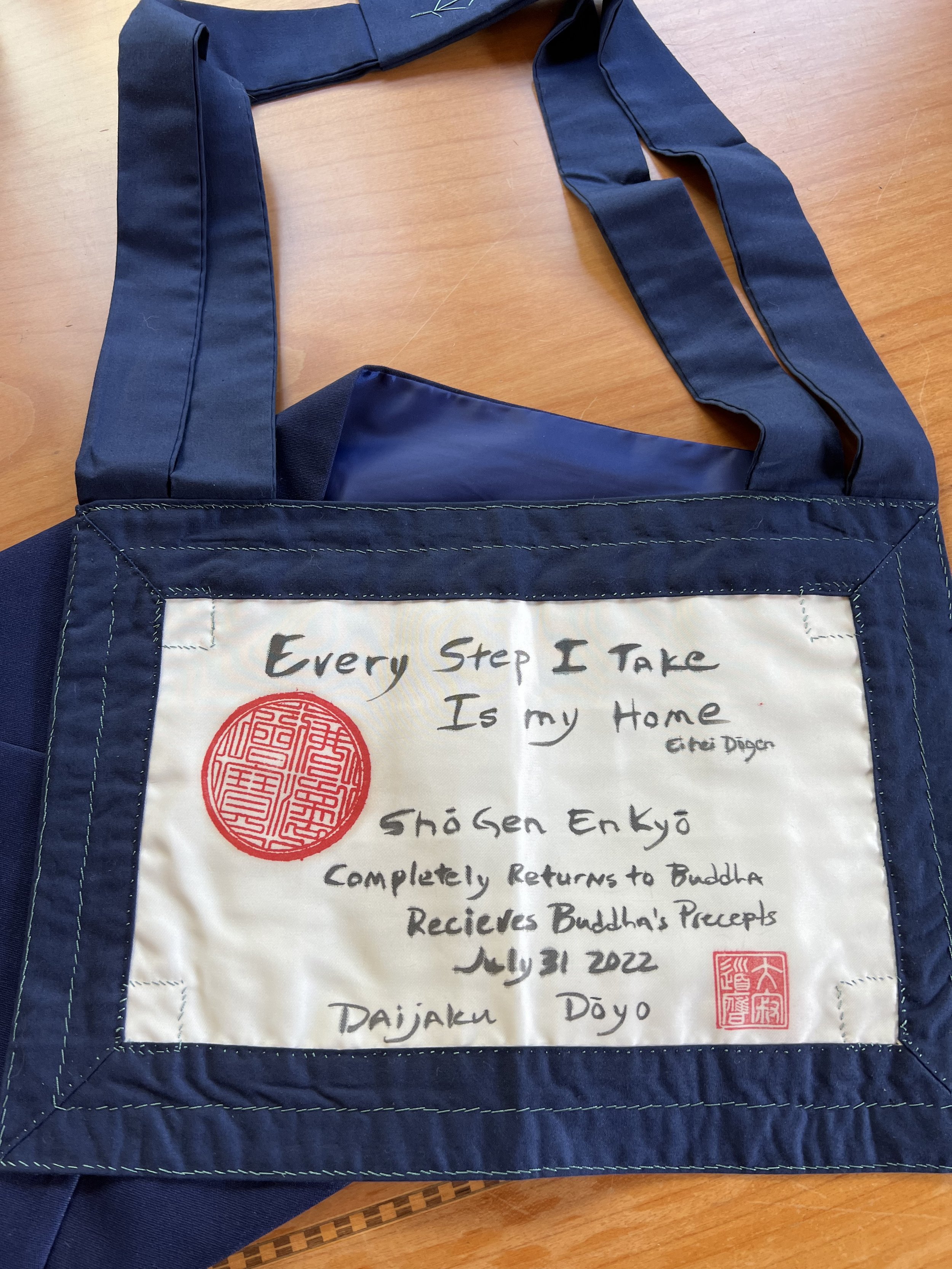 Jukai means “coming home,” as in, coming home to the Buddha, Dharma, and Sangha, your true teacher, teachings, and family. Coming home just at the moment of leaving home was exactly the initiation I needed. On the back of the rakusu, the teacher writes your name, her name, and a phrase to guide you. My rakusu bears a quotation from Dogen Zenji, the founder of our lineage of Zen: “Every step I take is my home.” This phrase will guide me as I leave home to come home.