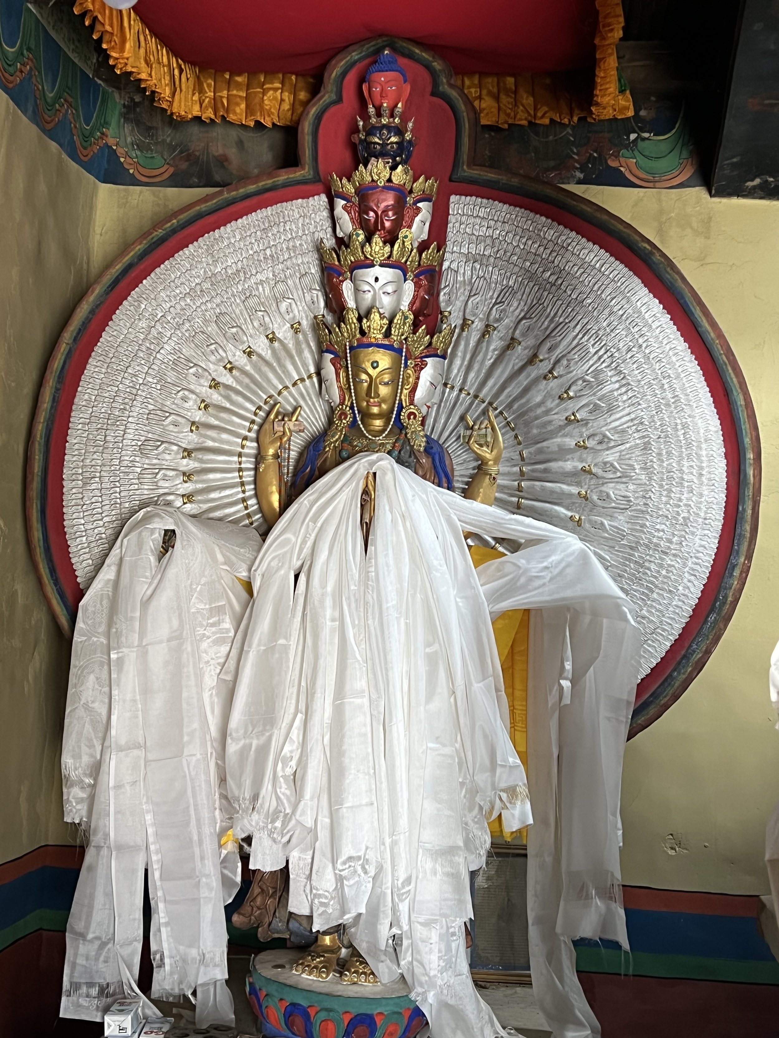Later in the day, we walk up through the town slowly, a little groggily, trying to take it all in and maintain the breath at the same time. We walk up and up to the top of the town, to a 14th-century temple complex that has also been a fort many times over. We pause frequently looking back to the South, as I did in morning practice. This time, though, the entire Indus river valley unfolds itself, East to West. I stand on a perilous but miraculously enduring walkway around the temple and imagine spiritual seekers and teachers, invading armies, tradespeople, artists, artisans, and ordinary people of the transhimalayan region moving back and forth across this landscape for a thousand years. And I imagine people sitting up above the valley in this temple that is also a fort, witnessing the coming and going, the transitions from West to East and back again, through the centuries. I stop in to pay my respects to Avalokiteshvara, the Bodhisattva of compassion with a thousand arms and eyes, around whom so much in these parts revolves (and about whom there will be much more to say). I put my forehead on the cool stone floor of that room of the temple and ask for relief from suffering—mine, yours, every bit of the madness and delusion that is afflicting this world.