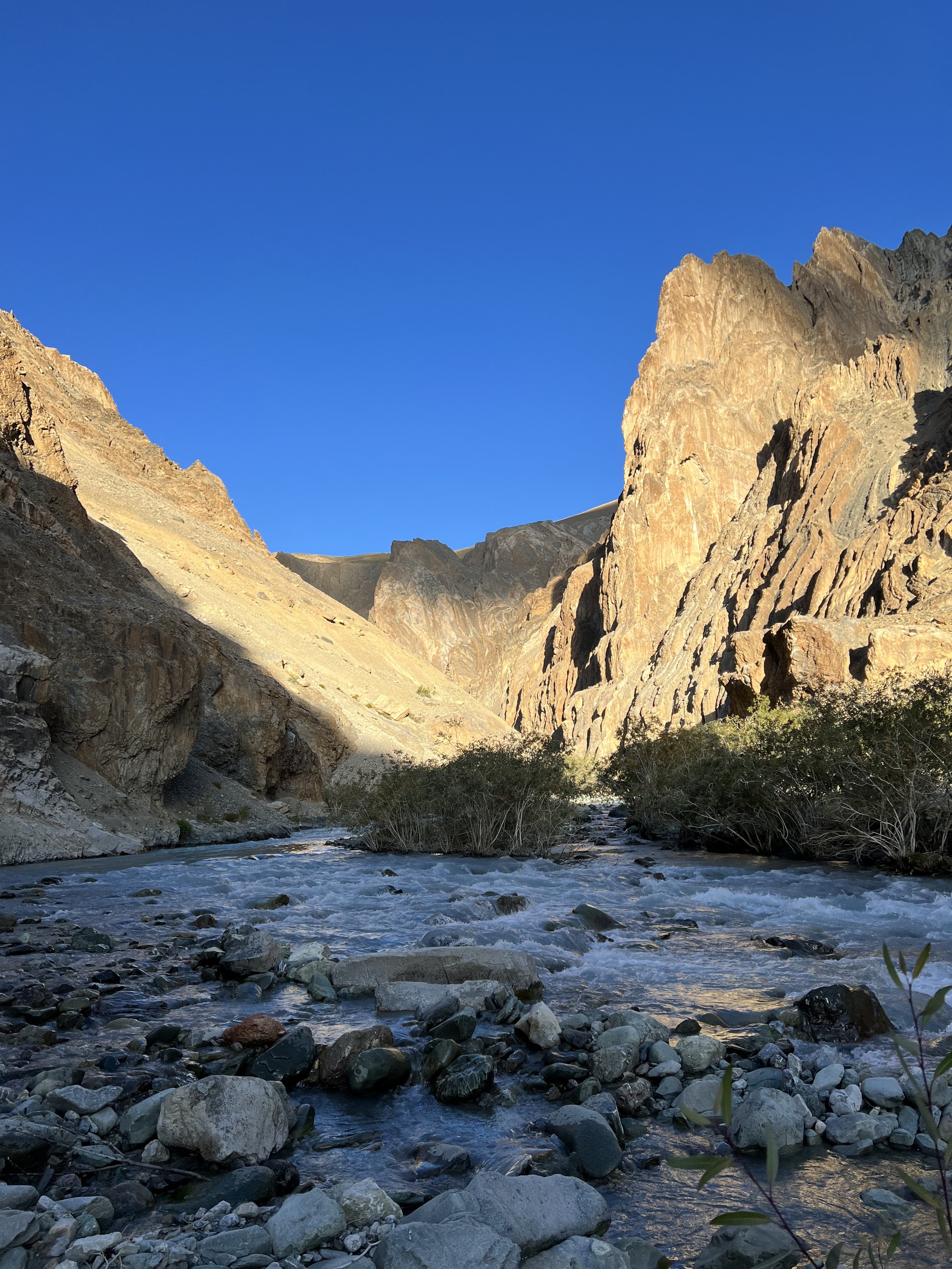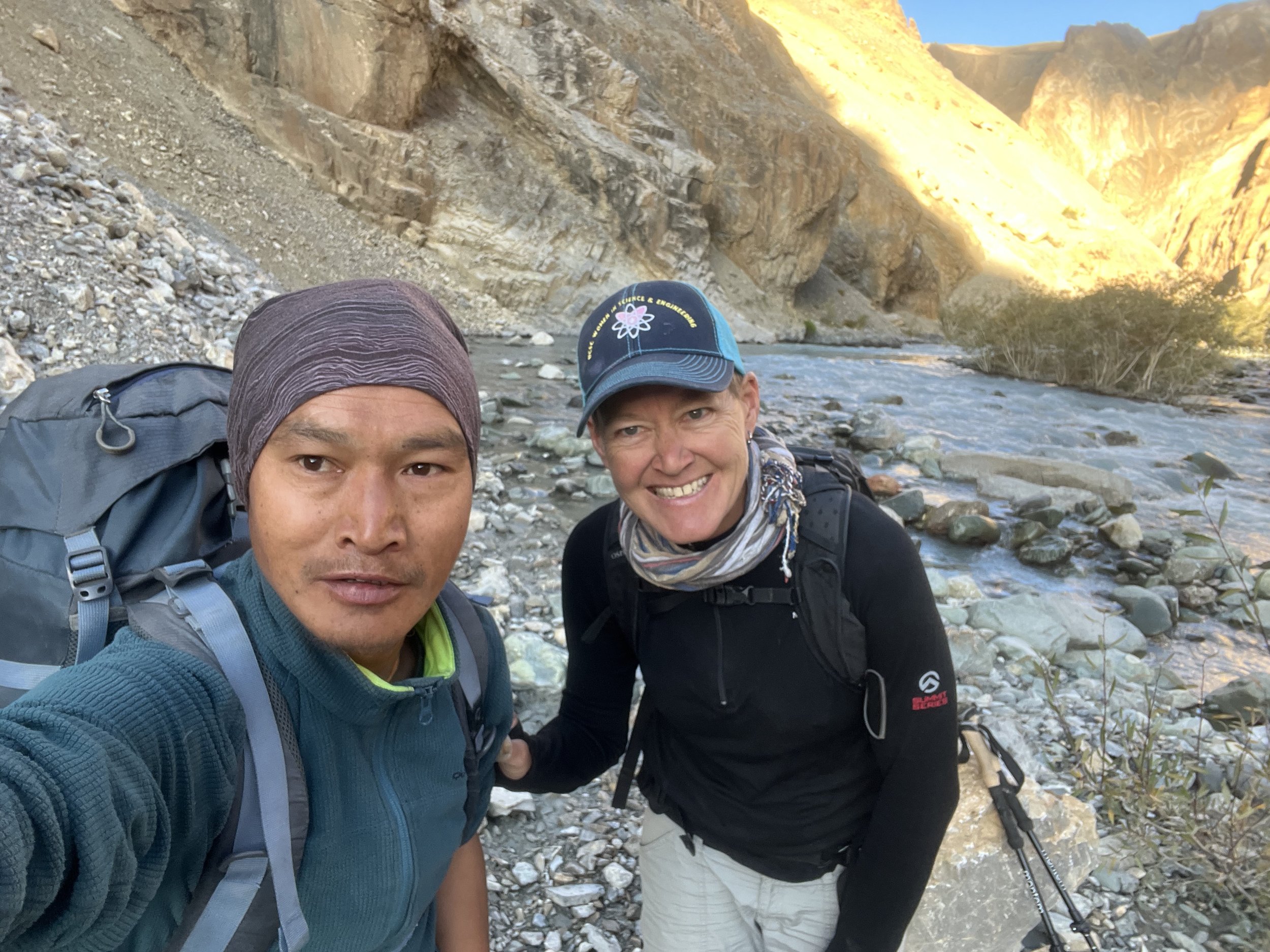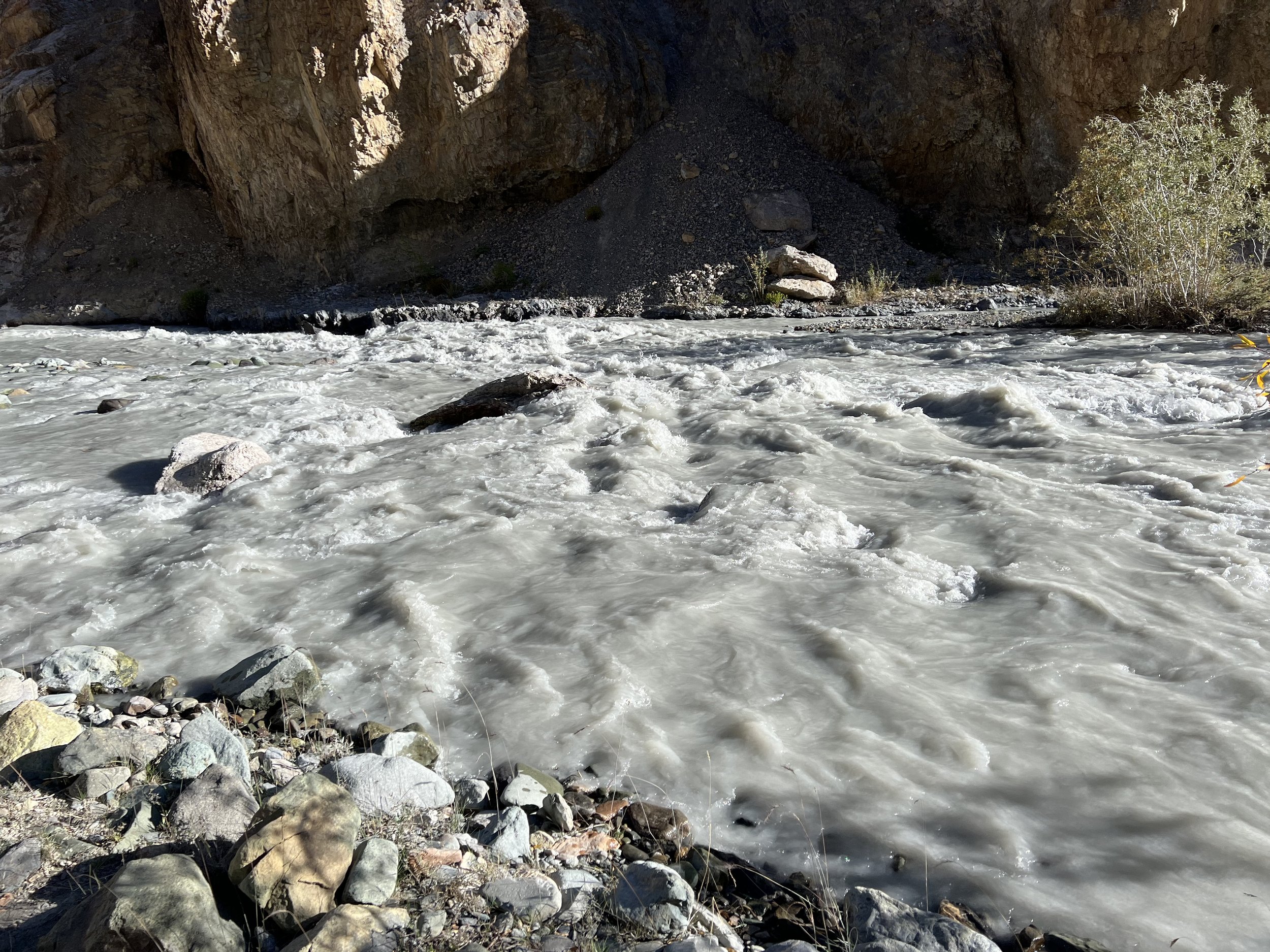 After a few hours and a significant amount of backtracking, we did make our way out of the gorge, but I would say it was the first time I’ve felt real fear in all my years of trekking here, and also the first time I’ve wondered if we’d have to turn back. Of course, turning back is not so simple when you’re dealing with a river swollen by multiple channels of glacial melt, so part of the fear was just how we would situate ourselves if we could move neither forward nor back as the day went on and the river rose. I noticed the repeated practice of bringing my attention back to the immediate present: the next crossing, the next possible climb up and over a cliff band to avoid a crossing. I noticed how Jigmet and I looked to each other repeatedly (and somewhat unusually) to make decisions together, in mutual trust. And i felt the enormous upwelling of gratitude, grace even, when the later crossings consistently turned out to be less demanding than the earlier ones—less deep, with a slower current, and warm sun to dry our clothes as we walked.