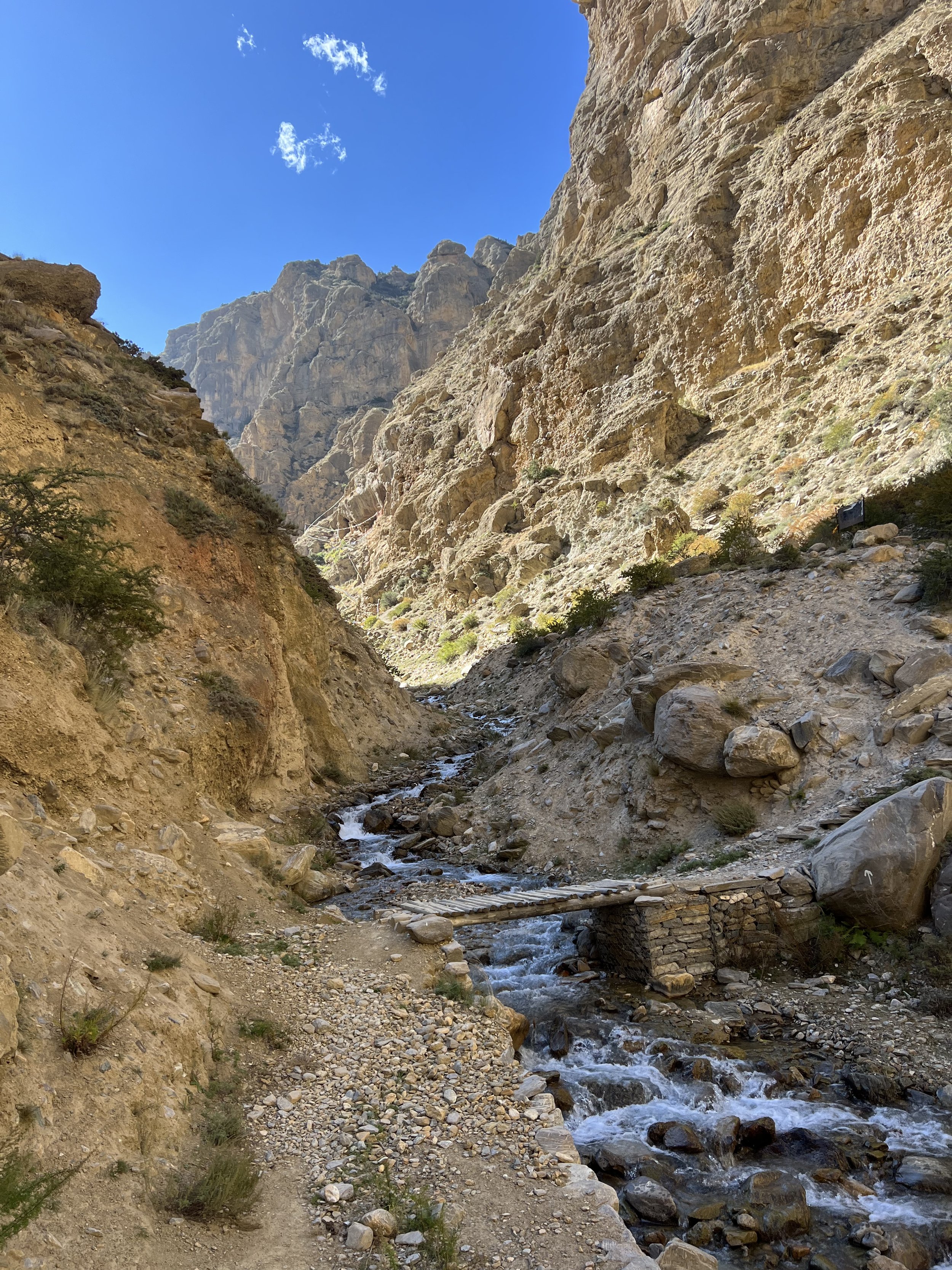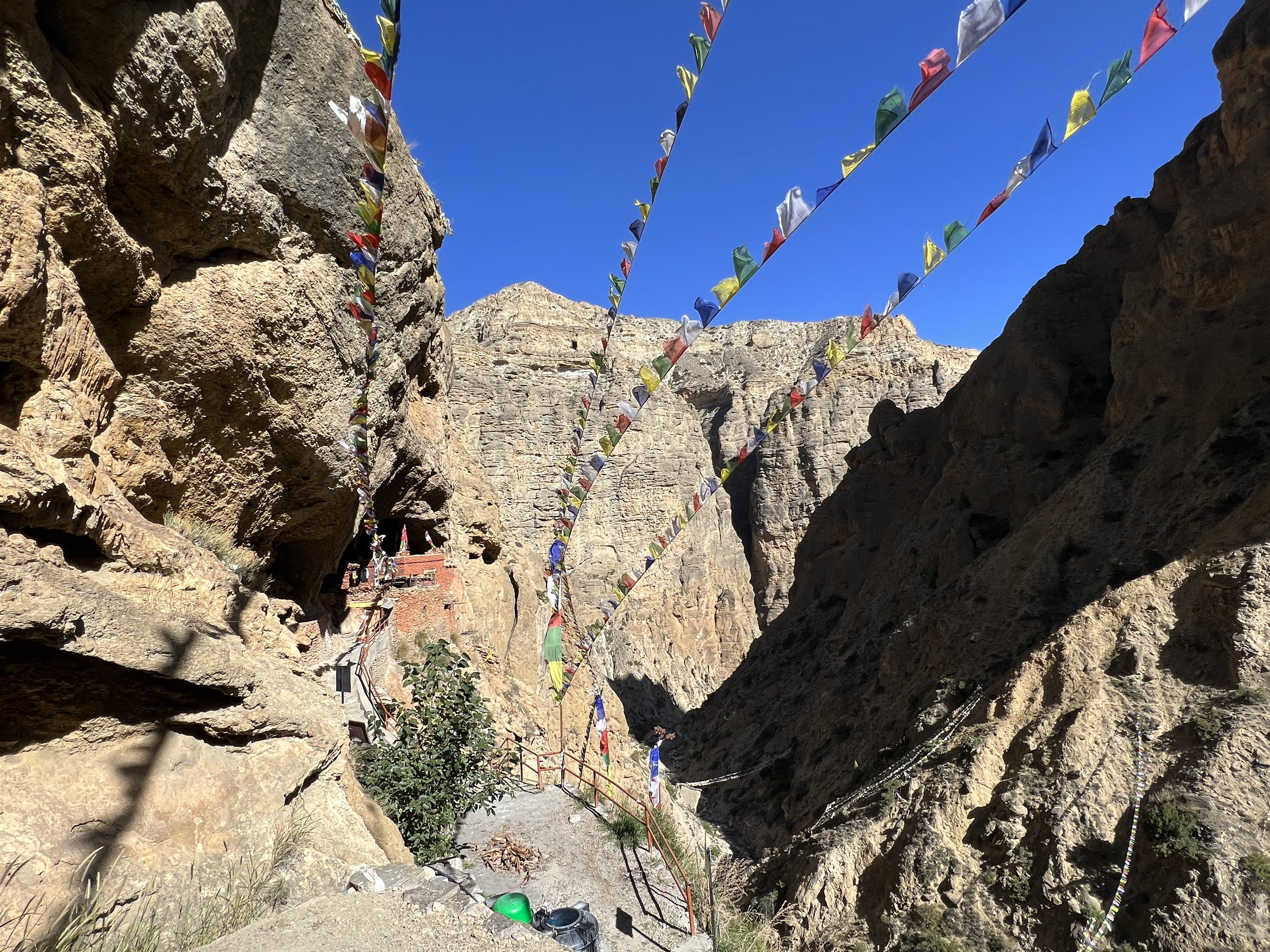 I took a left in the direction of the sign and underneath the rows of prayer flags and followed the little path along the stream and up the side canyon until I saw: stairs. Lots and lots of stairs. My legs were shot at this stage: five hours climbing and two of descent made stairs feel like an impossibility. I could see from the bottom of the descent that there was only one way to go to get to the night’s teahouse: up a sheer gorge with vertical rock walls back out of this vast canyon. I briefly considered waiting for Ram and Man, but I also knew already that, notwithstanding their different faiths, neither enters gompas or other sacred sites with me. Both remain outside and wait. I figured they might also appreciate being spared the stairs, and I never had a moment’s doubt they would know where I was when they caught up.