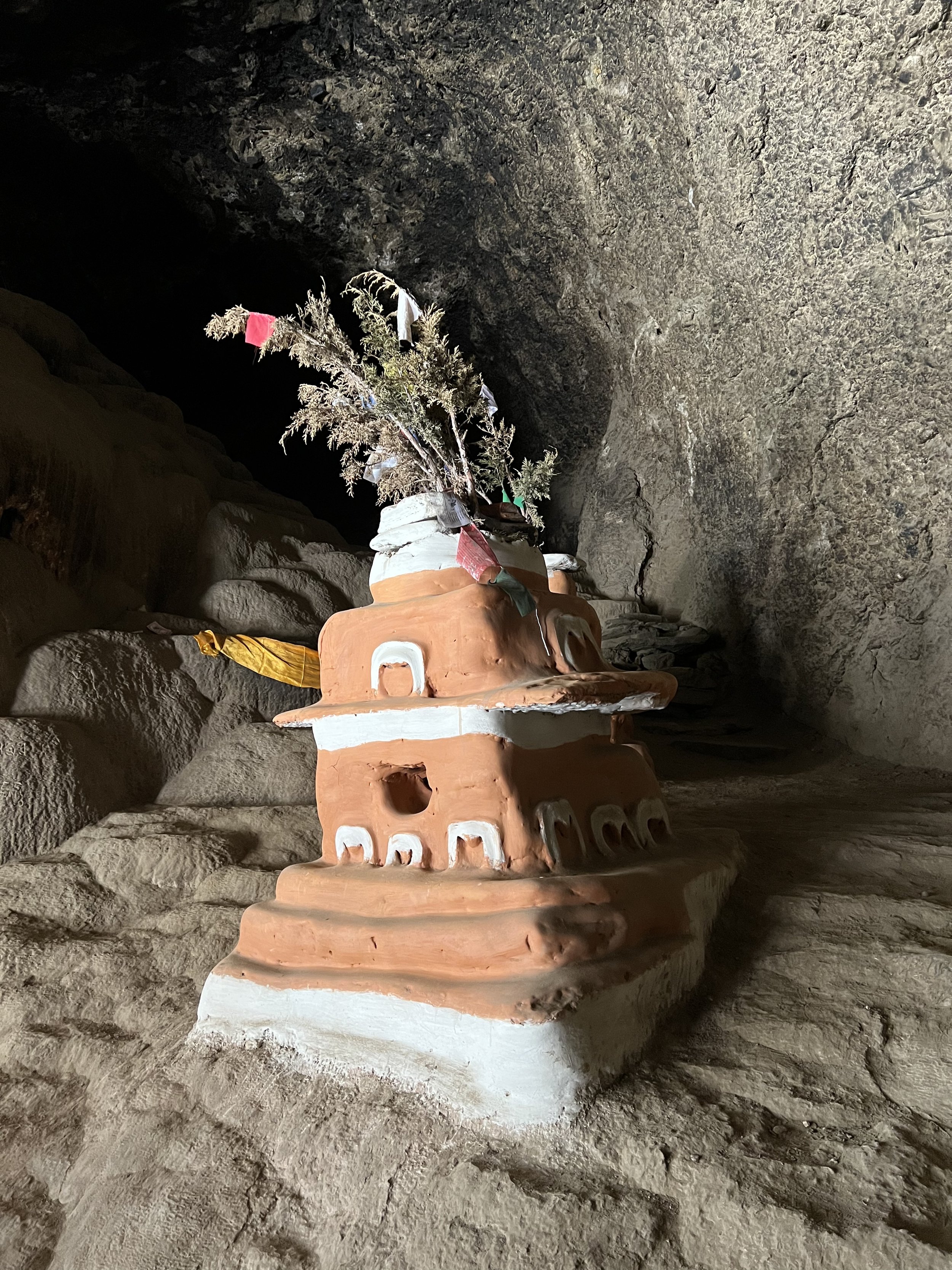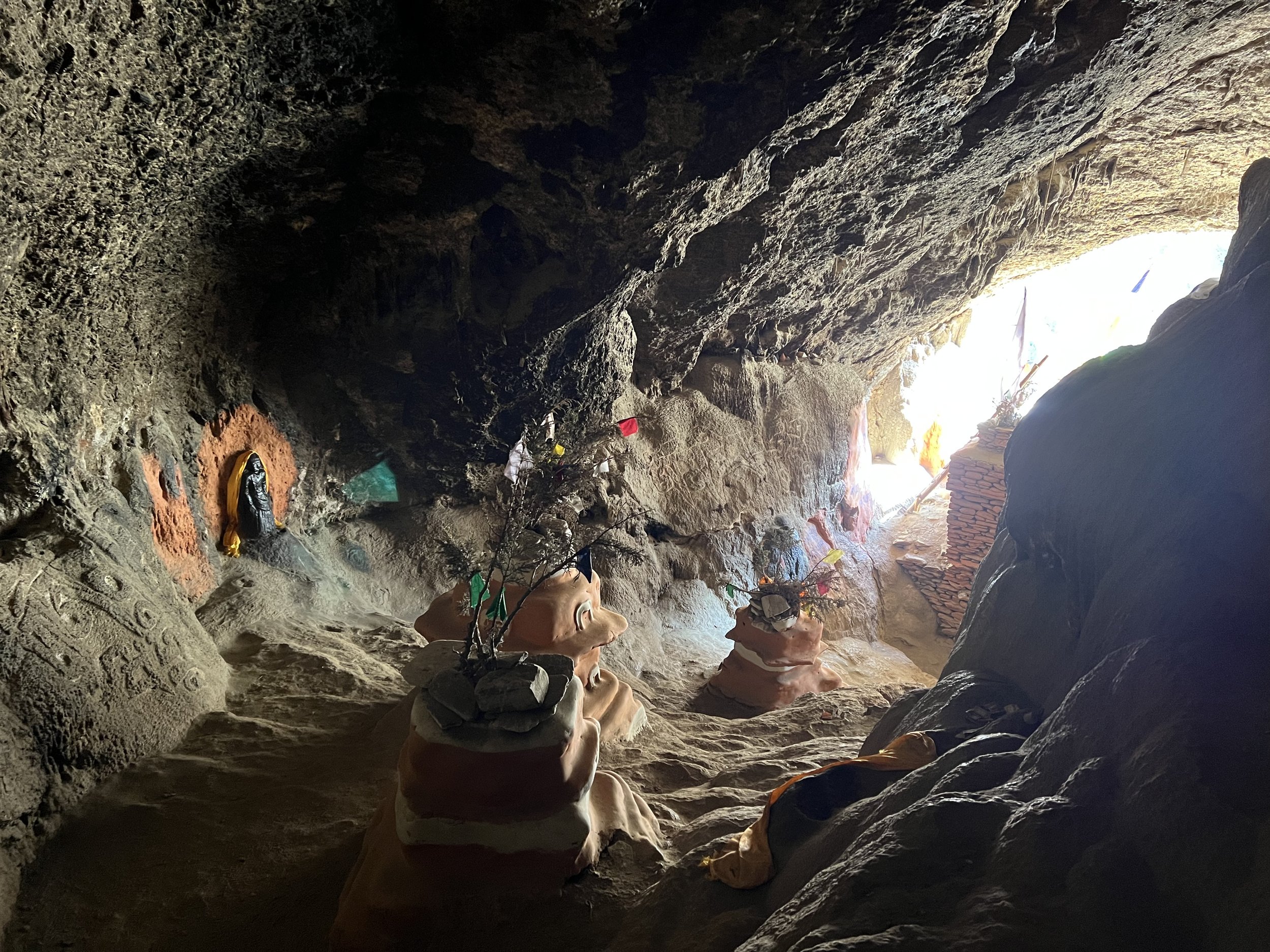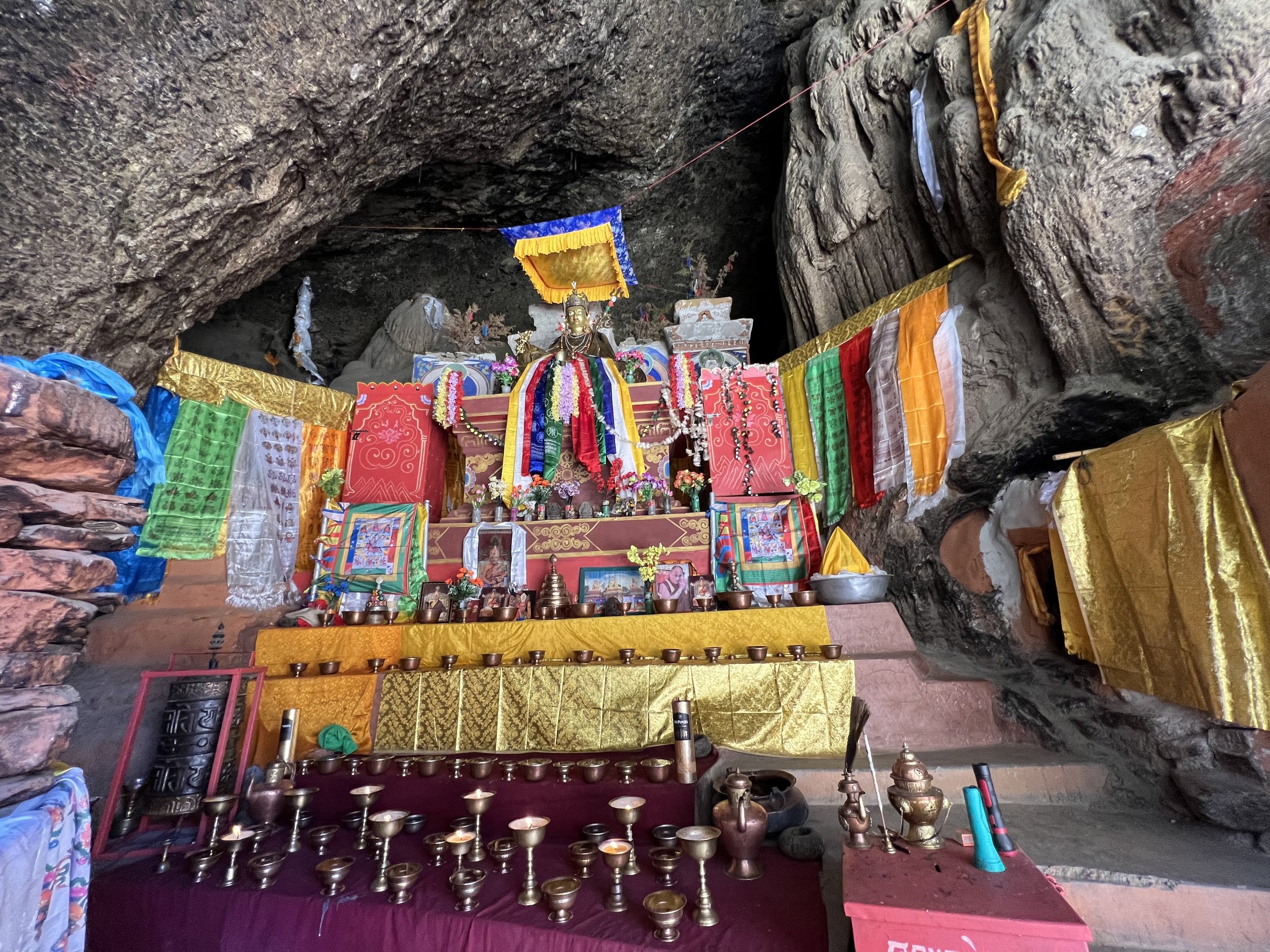 After exploring the cave—though quickly, because for me the energy felt almost too strong to linger—i stayed and drank tea with the monk for a while, heart still pounding. Maybe it was the climb that left me breathless and dizzy—or maybe not. The weight and presence of devotion: that is the best I can do to put into words what I felt there. This is a holy place, that’s all I can say. Sacred and filled with the practice activity that has continued there, they say, for 1200 years. Some of what stunned me there was the freshness of it—the clean bright prayer flags flapping in the wind, the newly painted stupas and bricks, the khatak and the shining metal tea cups lined up for passing visitors, the monk in his spotless robes. This place is cared for, stewarded, guarded still on behalf of the great Beings whom we call to and whose presence I could feel, without question and without a doubt.