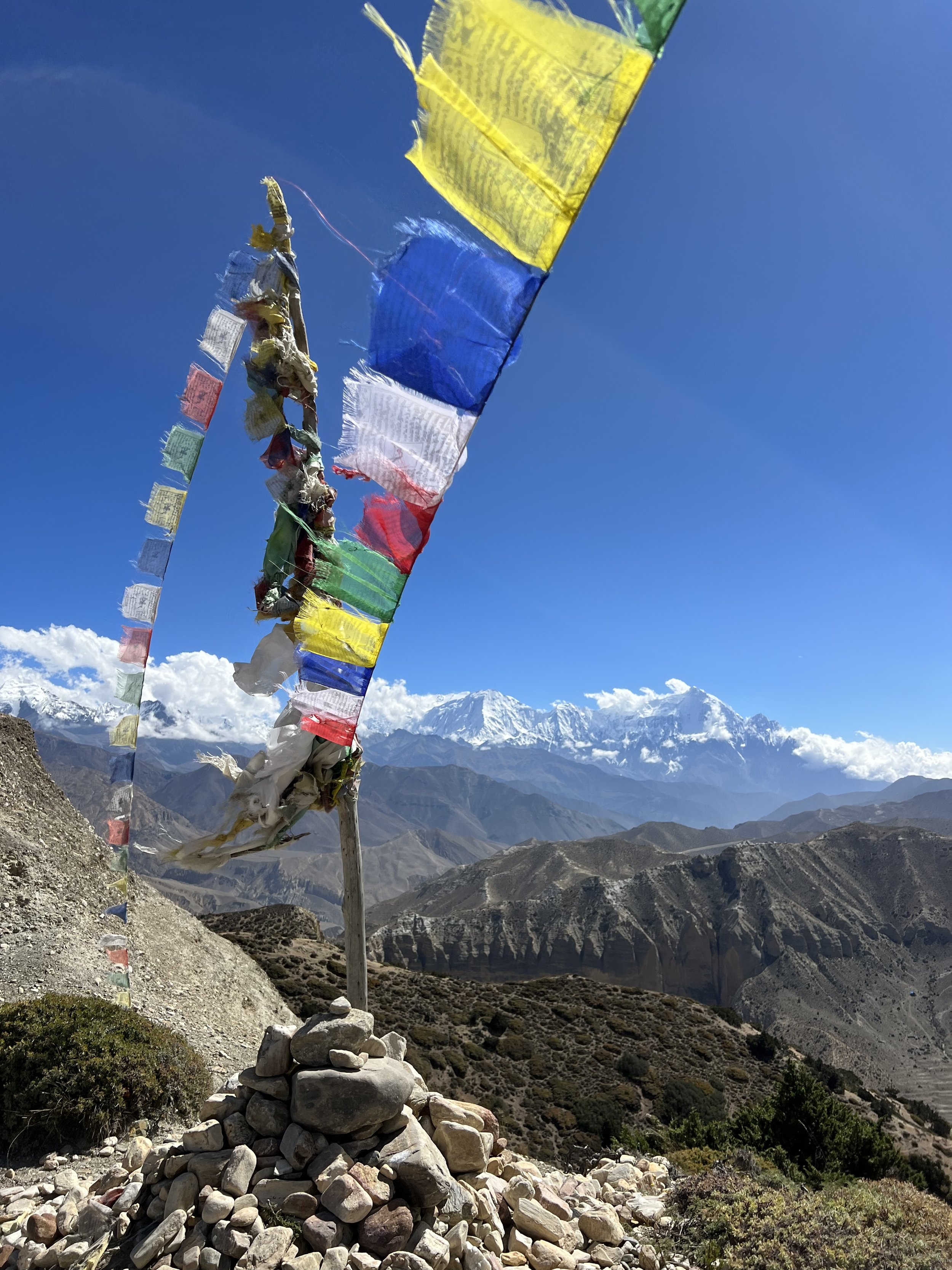 The three hours on the road were measurably leavened by the fact that with every 100 feet of climbing, more of the mountains showed themselves behind and to the East. First Nilgiri, then Daulaghiri, then Annapurna 1: it felt like the ancestors were revealing themselves—at least to me. To be walking in a dry desert with 7-8000 meter snowy peaks looking on was marvelous. I felt something close to held in this vast and varied landscape of sand, glacier, juniper, buckwheat fields, and apple orchards.