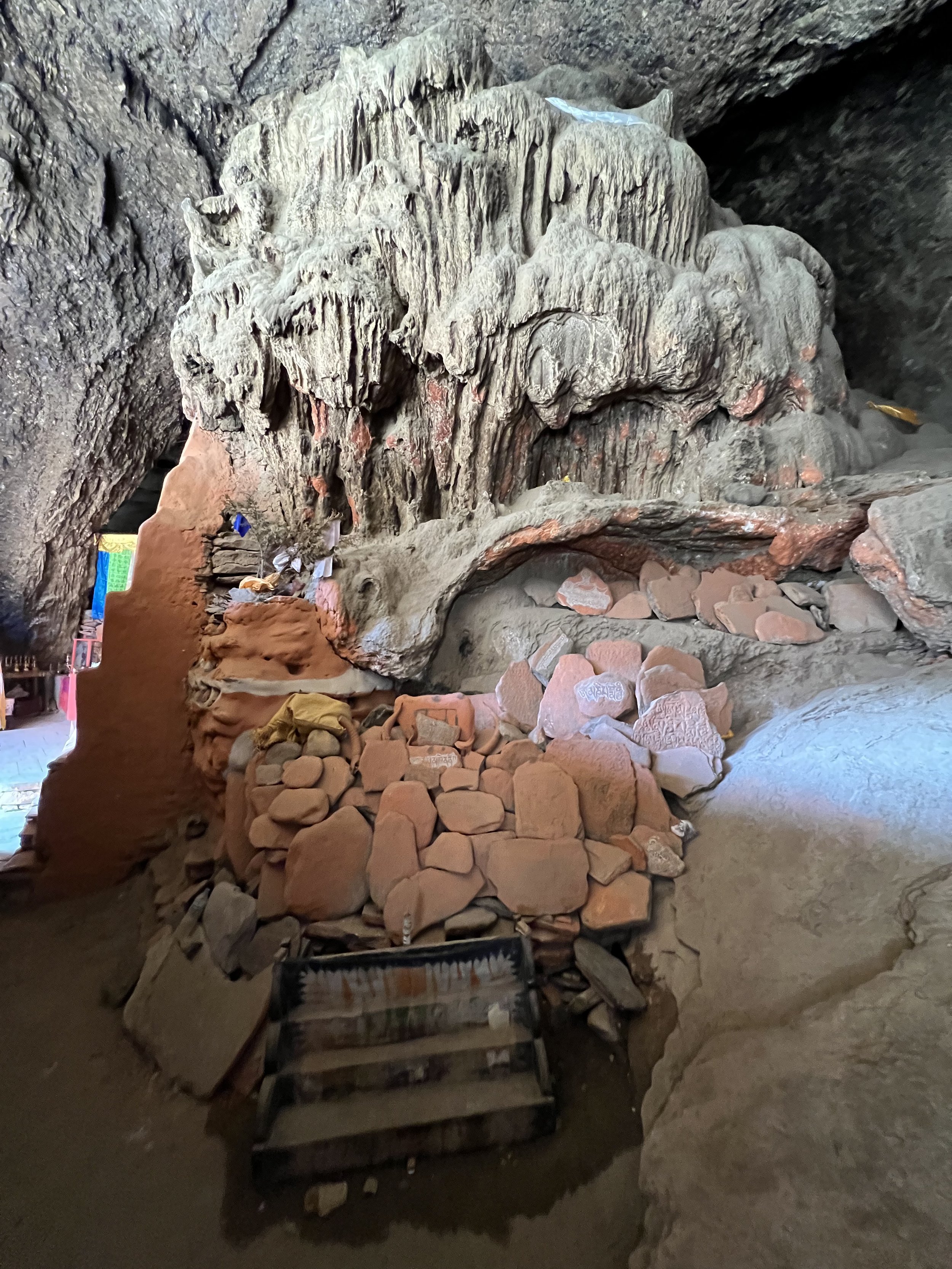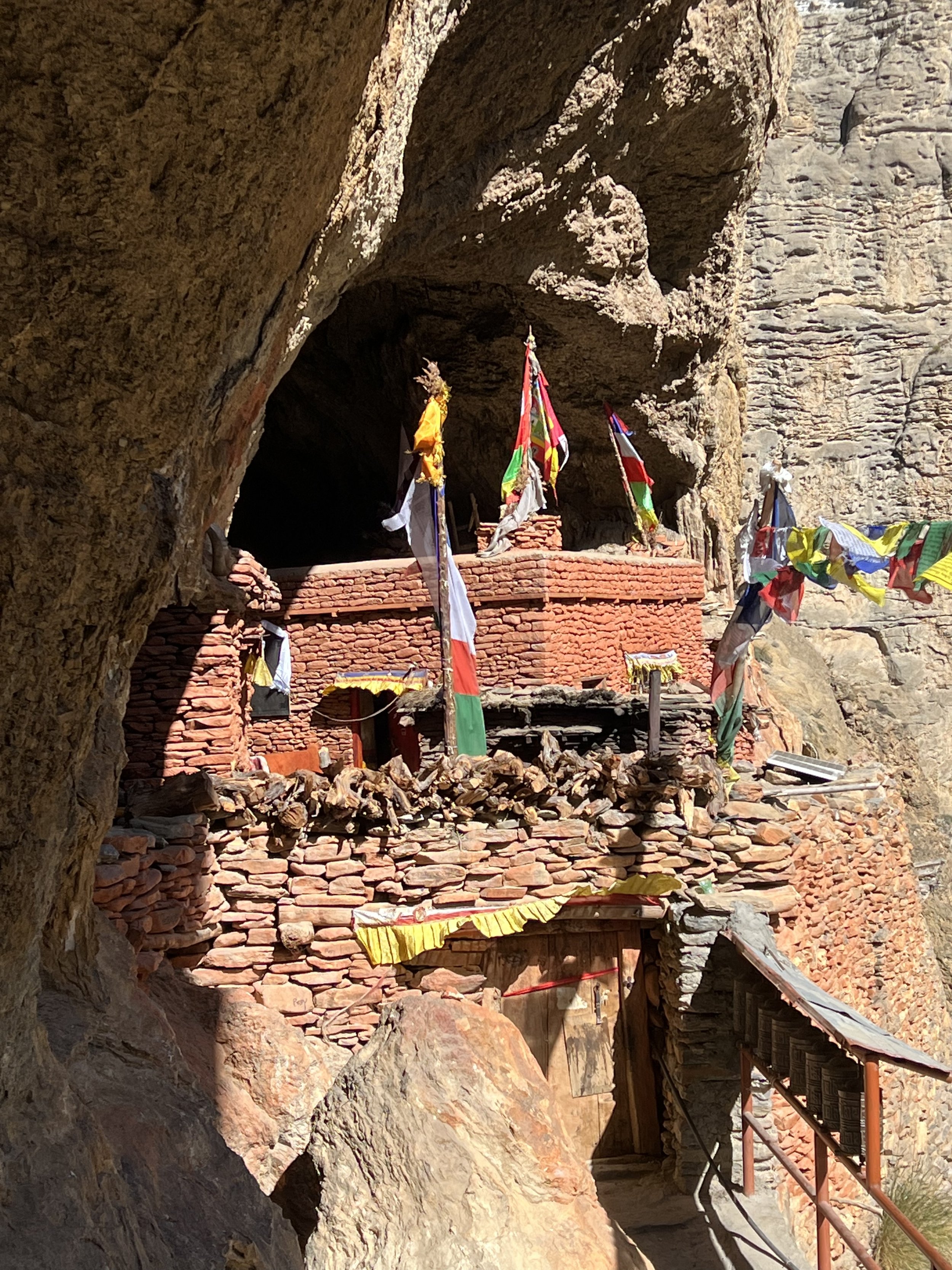 The stairs were a beast, but that pressure pulling me forward kept me moving. If not that, what? My legs were trembling and I had to use the handrail to climb. My ears were also full of a kind of rushing sound—pointless to try to describe it, but also something I have noticed before in places charged with long practice. I started to be able to see red walls built into the side of the canyon—bricks, small windows, more prayer flags. I finally came to a small wooden door clearly leading into the cave complex, which was mercifully unlocked. I pushed the door open and found myself in a beautiful little courtyard full of flowers opening out from—the cave monastery. I was so stunned to see a monk standing there quietly washing tea cups that I just mumbled something like “OK to go?” and pointed toward the buildings and started climbing, fast, into the cave into which the temple was built. I’m not sure who was more surprised, but by now I felt I just had to keep moving.