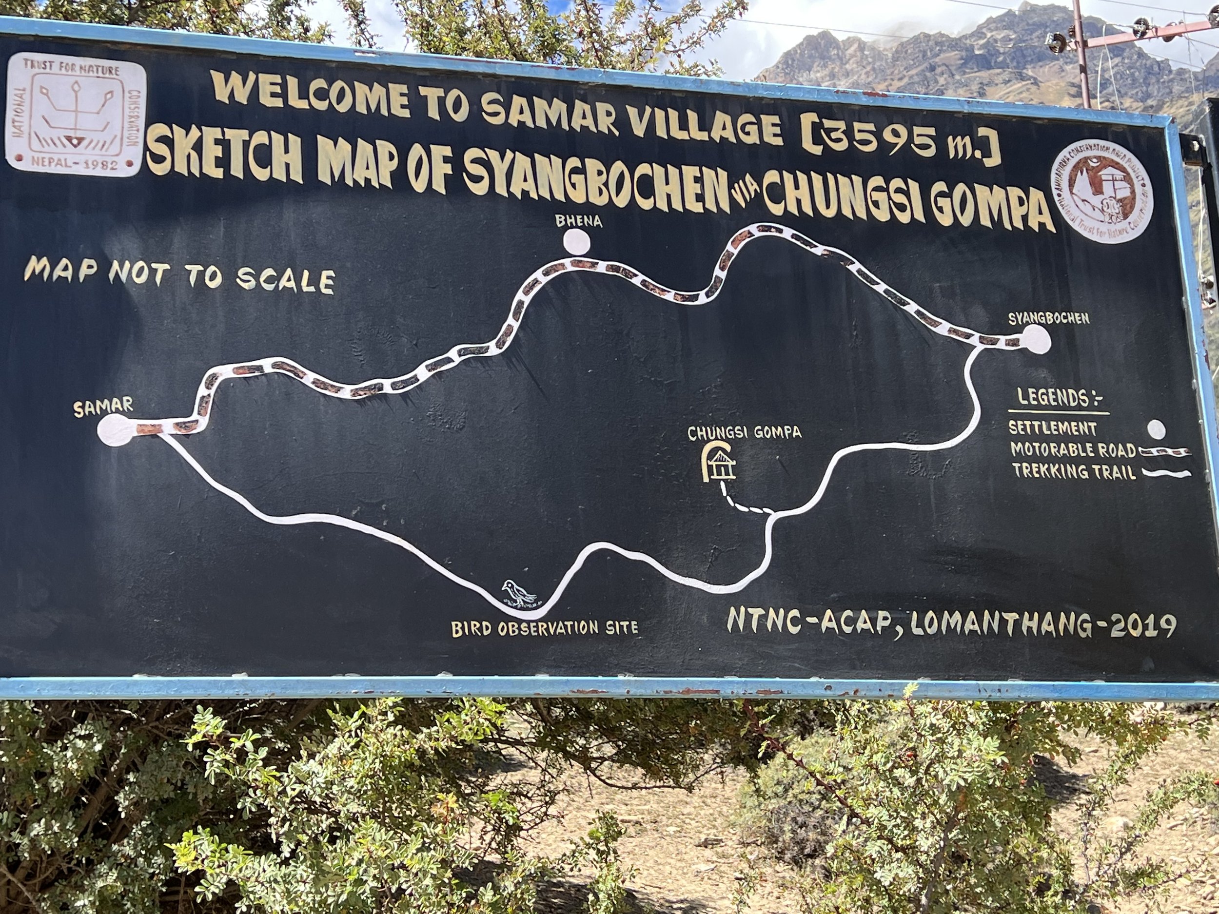 We stopped for lunch in the small village of Samar with the promise that the afternoon would be all off-road, with lots more up and down but with the promise of a “cave monastery” somewhere between us and our destination. A sign at the edge of town showed the trekking route to the monastery, Chungsi Gompa, as well as a place tantalizingly called “bird observation site.” So much to love here.