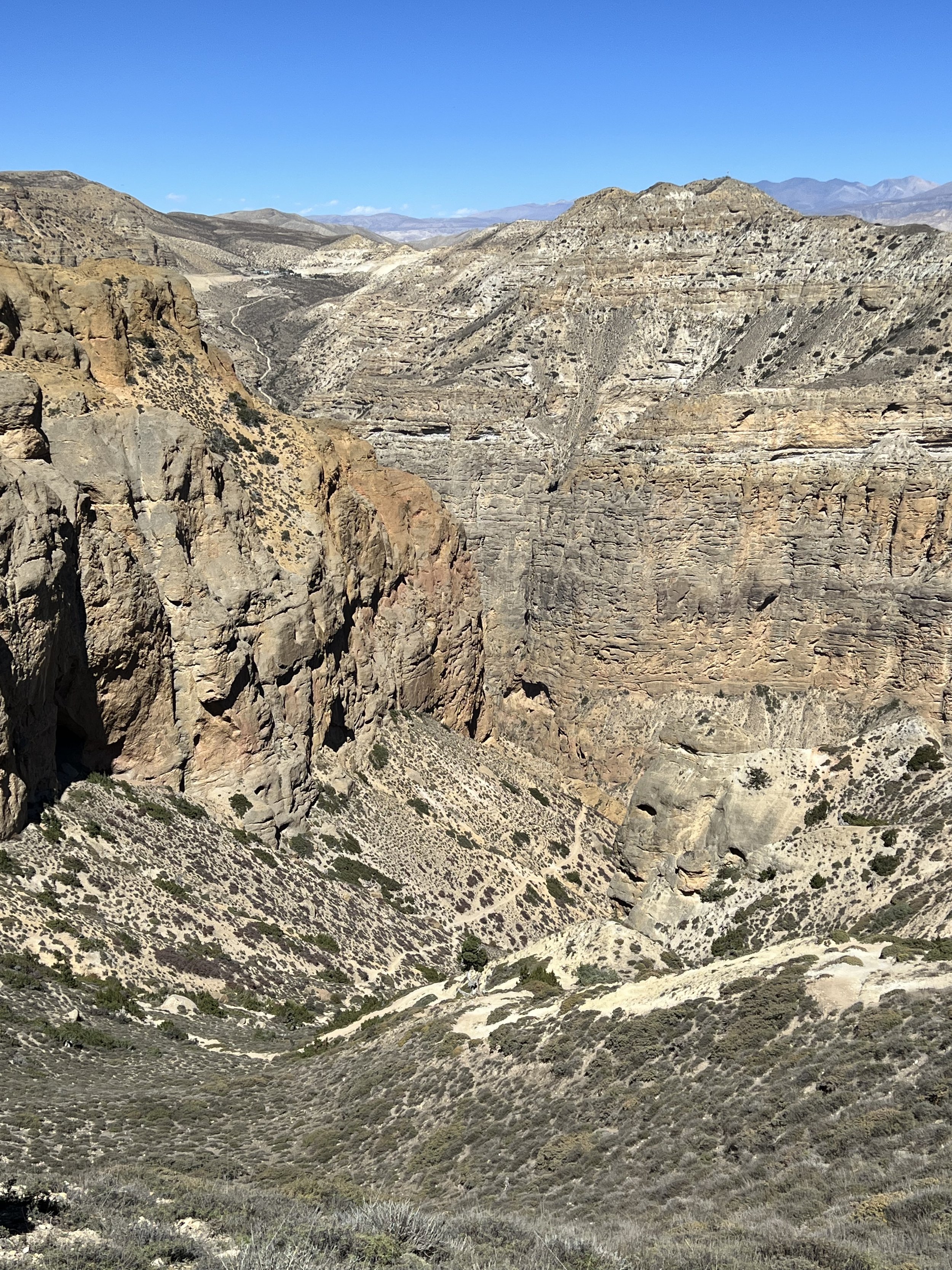 I crested the pass, happy to see the familiar mix of prayer flags, khatak or white scarves, a small stupa made of rocks. This was starting to feel like familiar territory, up to and including a howling cold wind on the pass. I thought about waiting for my traveling companions, but a combination of the wind and the fact that I still had no idea where the cave monastery was kept me moving. Ahead of me was an astonishing landscape—-a canyon so grand i could not believe i’d be descending to its bottom and climbing up the other side. But with no village—and no cave monastery—anywhere in sight, what to do but descend?