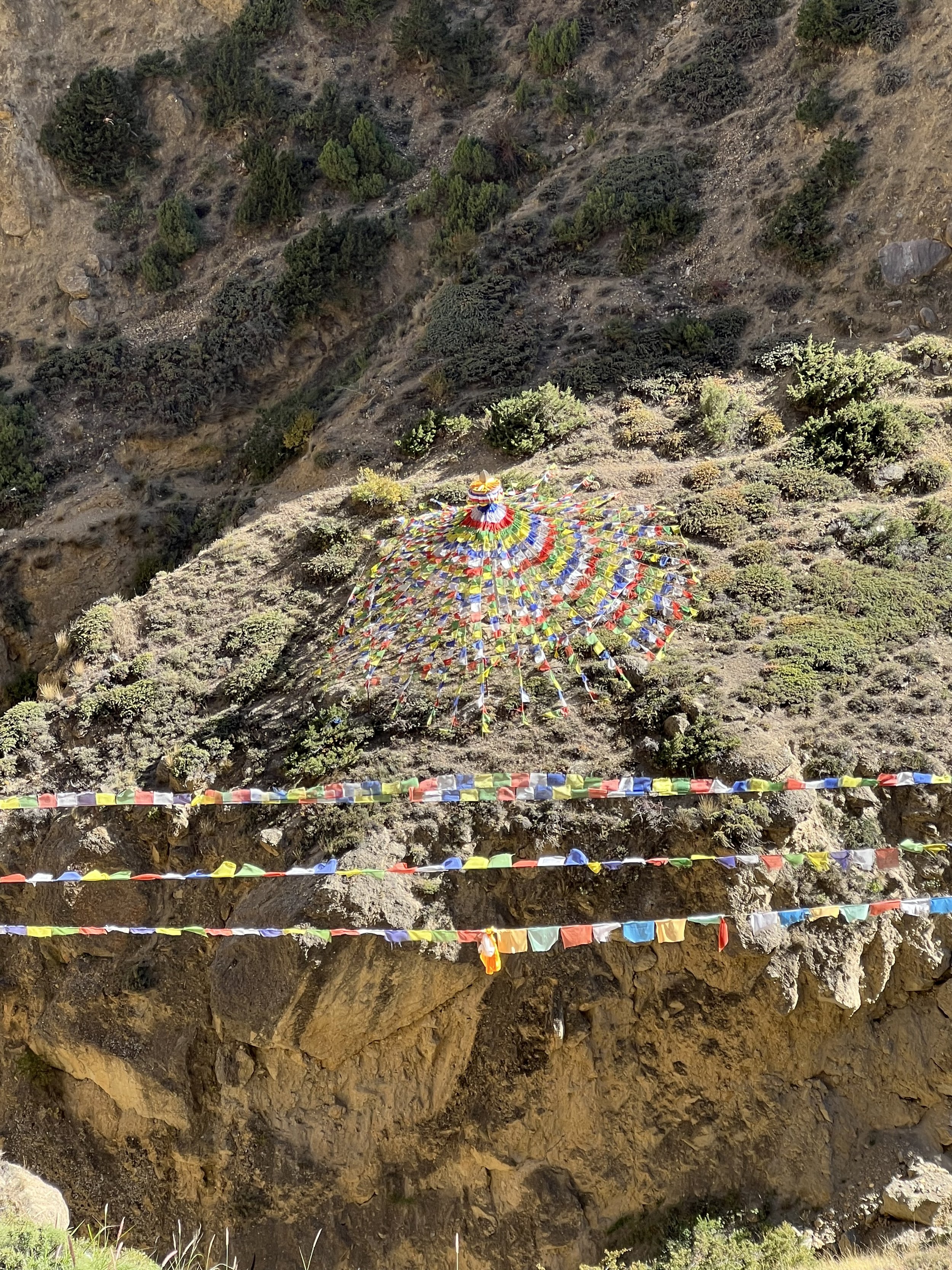 Nearly two hours later, far down near the base of the narrowing canyon, I heard the fluttering of prayer flags before I saw them. I mean, a lot of fluttering. I also saw a sign suggesting that perhaps I was about to come upon something more elaborate than an empty cave in the wild where some wandering yogis occasionally did practice. As I crossed the sidestream forming the base of canyon, energy building in my chest, the shadows of hundreds of prayer flags strung across the rock walls bordering the little stream were bouncing all over the huge rock faces all around me. I looked up to see flags everywhere, wall to wall, up and down, out of nowhere, and even a gorgeous stupa made entirely of prayer flags, all new and clearly regularly replaced. What IS this place? This had become the only question.