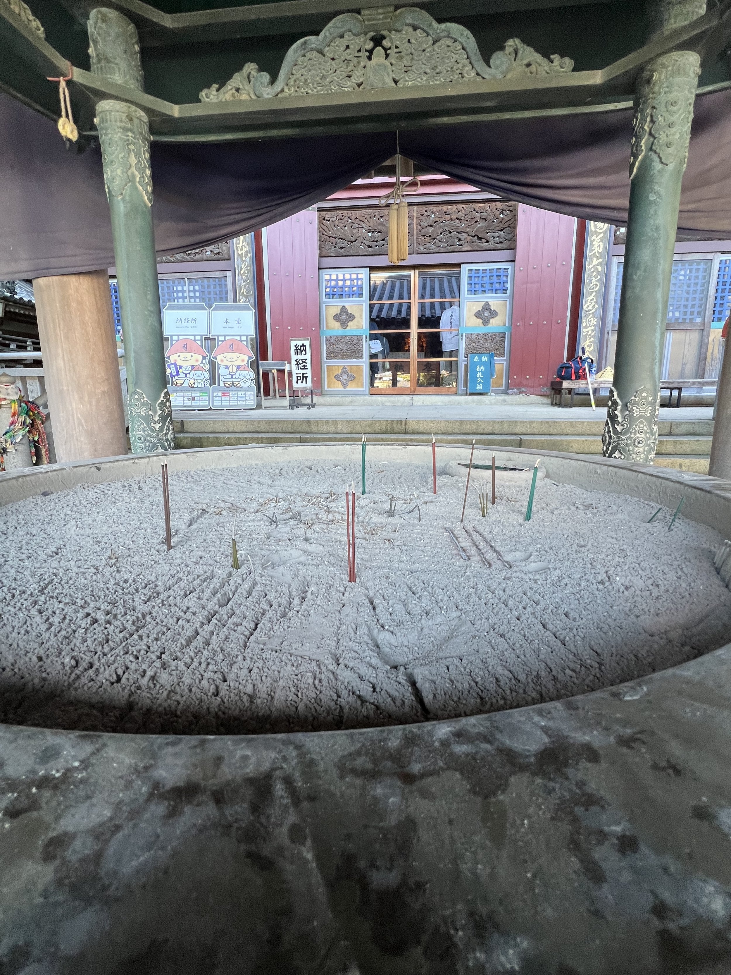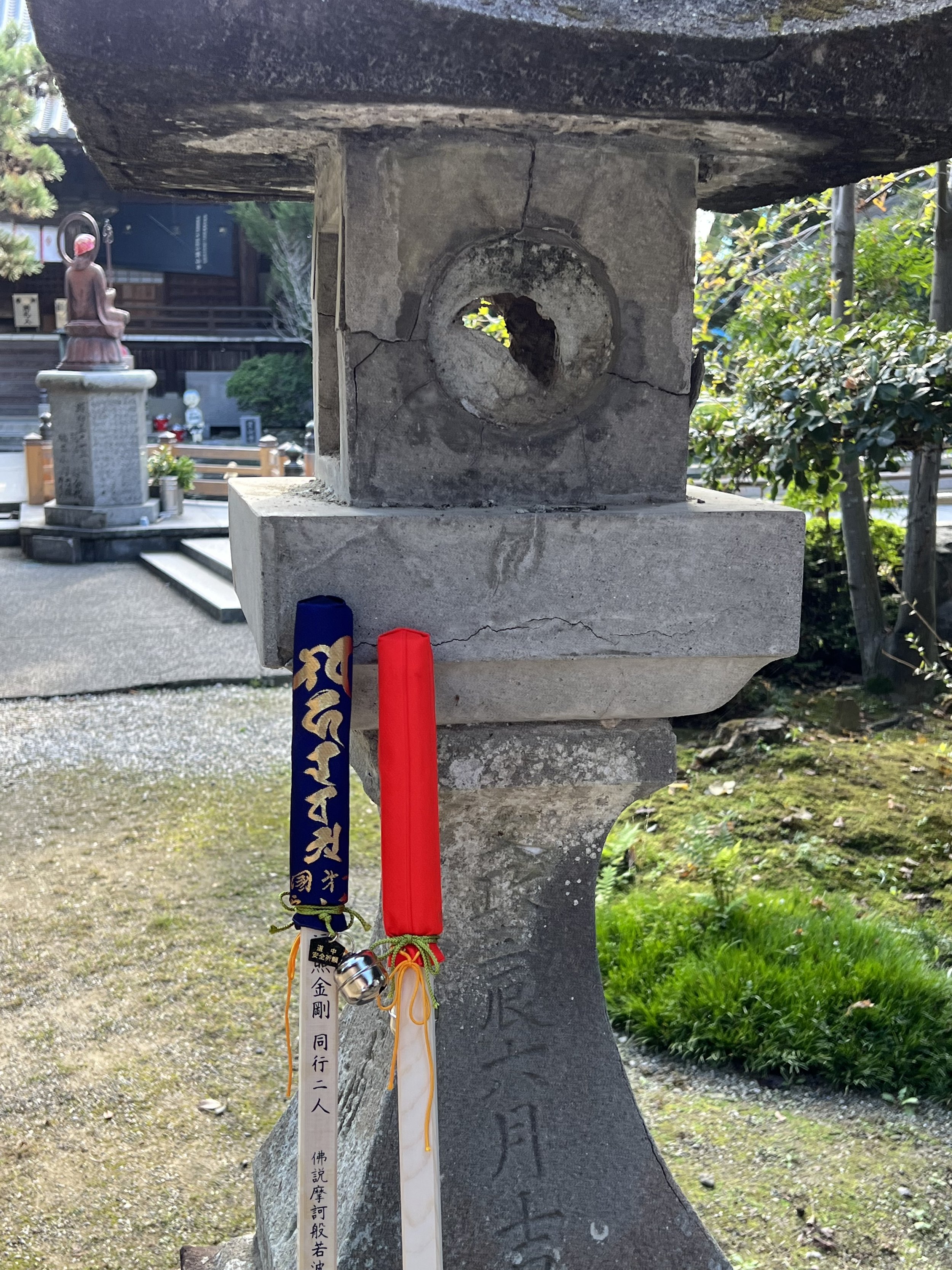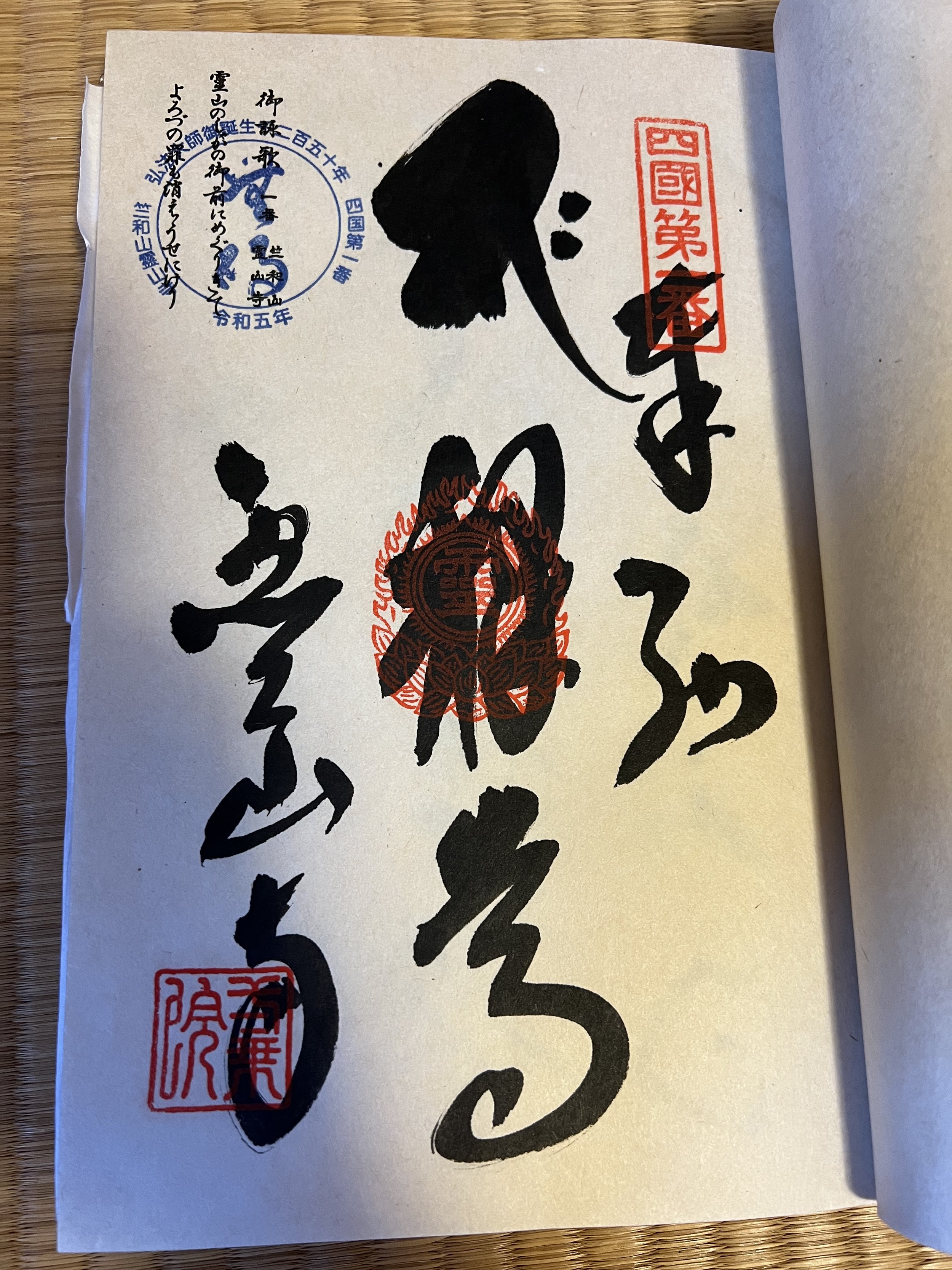 The ritual at each of the 88 temples is the same, though a couple of the initial steps can be left out if COVID has closed the washing trough or the bell. We bow outside the main gate and drop our packs somewhere. We stop and wash hands and mouth at a trough near the entrance (there is a specific, ancient, and safe method for this). We ring the giant temple bell to announce our arrival. We proceed to the main hall, which is nearly always locked, so we stand on the walkway outside. We light a candle, offer three sticks of incense, and chant the heart sutra, drop an osamefuda and a tiny donation. We then walk to the Daishi Hall, devoted to Kobo Daishi, also locked, and repeat the same steps. Sometimes there are other deities to visit. The most moving so far was a long walkway around the main hall at temple 4 with dozens of Kannon/Avalokiteshvara figures. I go to the stamp office (Dave has plenty of temple stamps from prior pilgrimages), hand the book to the attendant (there is a special way of doing this handoff), and watch her (nearly always her) do her magic with the brush and stamp She blots the page and closes the book. It goes back in the white bag, which we carry even when wearing our packs. I rejoin Dave, we grab our packs, bow outside the main gate, and head off down the road (and I mean road) to the next temple.