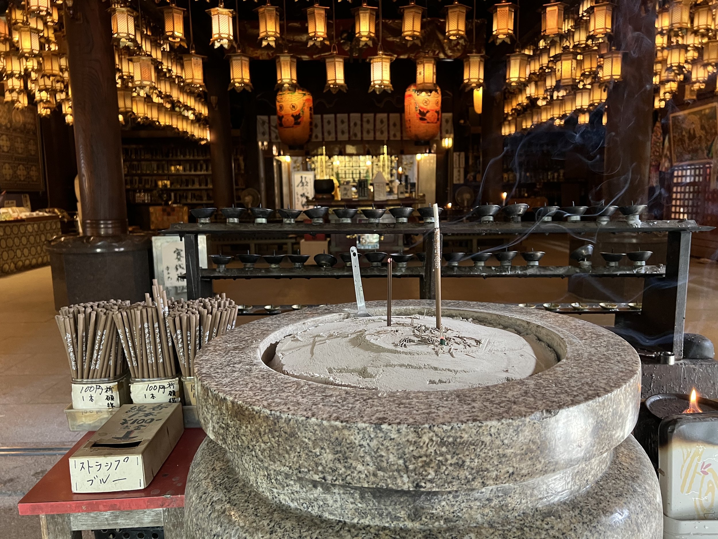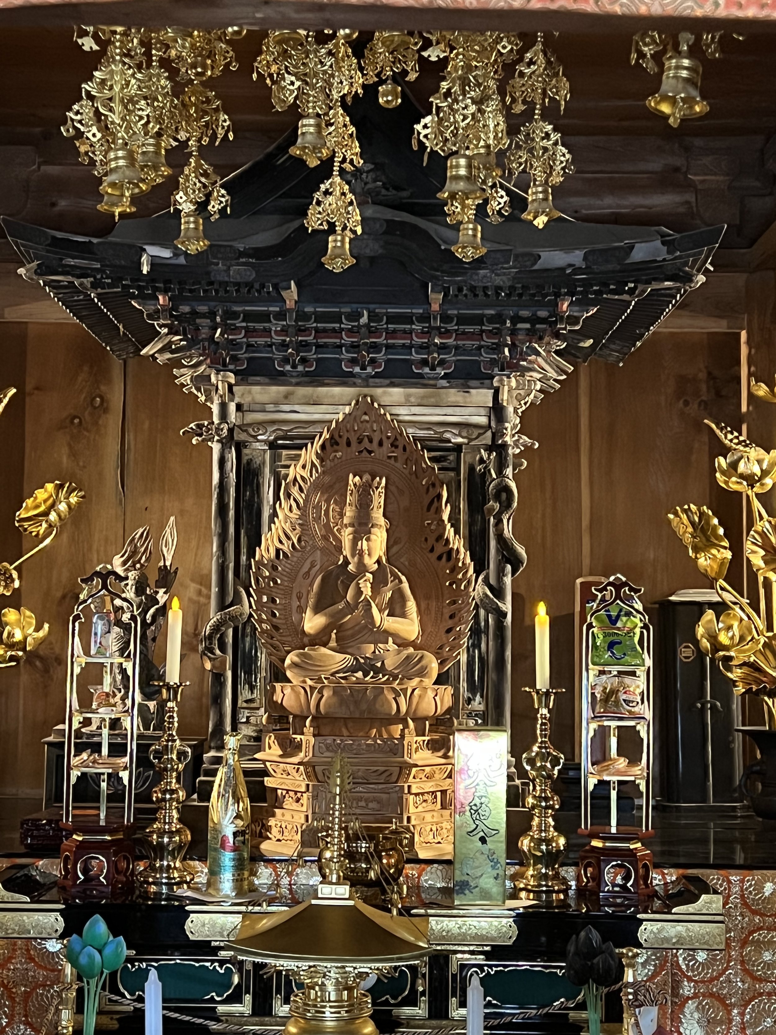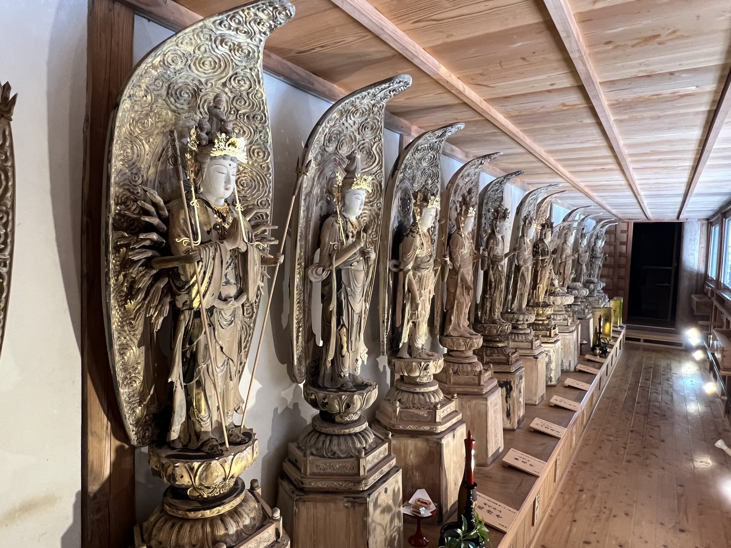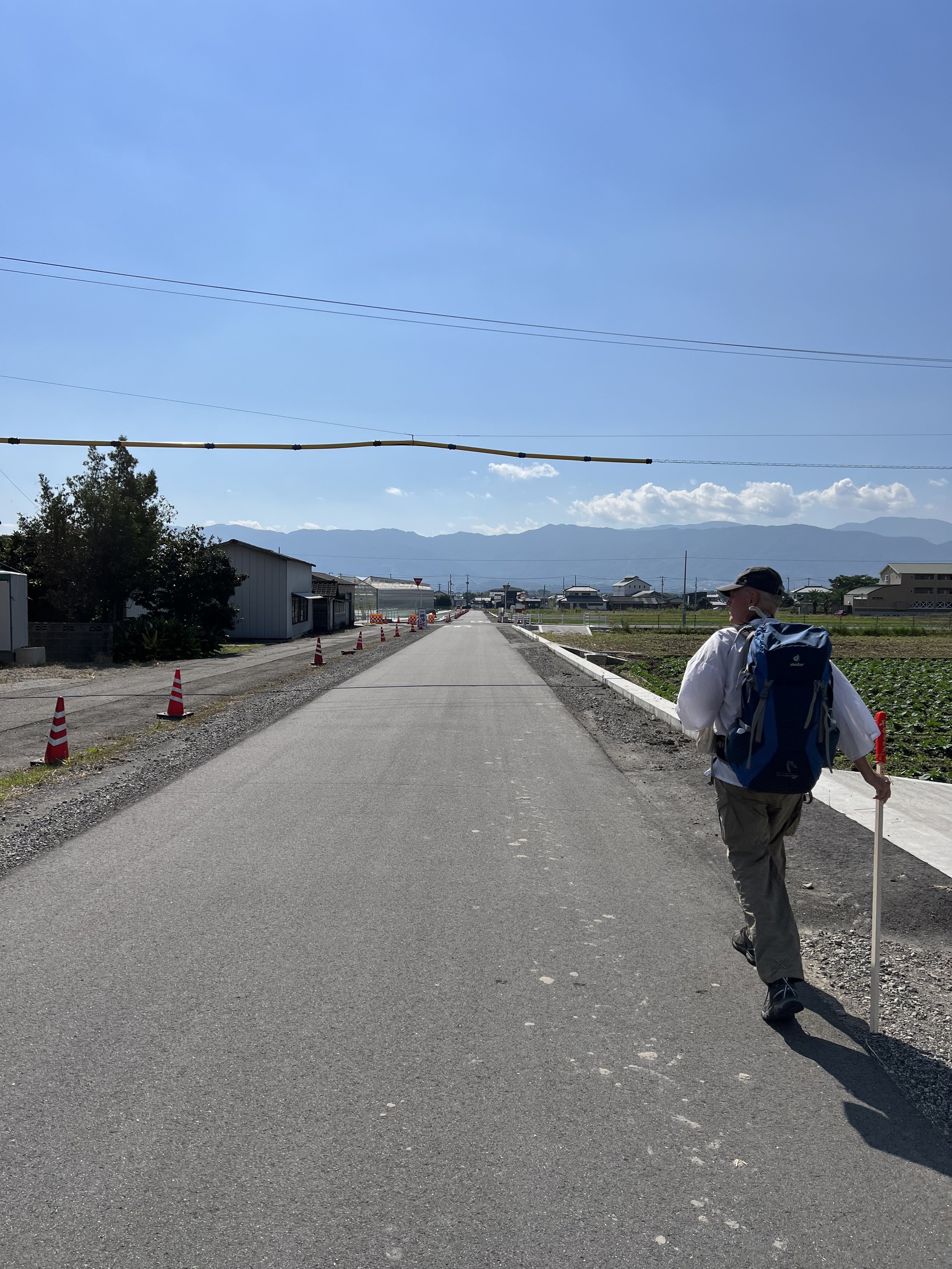 The ritual at each of the 88 temples is the same, though a couple of the initial steps can be left out if COVID has closed the washing trough or the bell. We bow outside the main gate and drop our packs somewhere. We stop and wash hands and mouth at a trough near the entrance (there is a specific, ancient, and safe method for this). We ring the giant temple bell to announce our arrival. We proceed to the main hall, which is nearly always locked, so we stand on the walkway outside. We light a candle, offer three sticks of incense, and chant the heart sutra, drop an osamefuda and a tiny donation. We then walk to the Daishi Hall, devoted to Kobo Daishi, also locked, and repeat the same steps. Sometimes there are other deities to visit. The most moving so far was a long walkway around the main hall at temple 4 with dozens of Kannon/Avalokiteshvara figures. I go to the stamp office (Dave has plenty of temple stamps from prior pilgrimages), hand the book to the attendant (there is a special way of doing this handoff), and watch her (nearly always her) do her magic with the brush and stamp She blots the page and closes the book. It goes back in the white bag, which we carry even when wearing our packs. I rejoin Dave, we grab our packs, bow outside the main gate, and head off down the road (and I mean road) to the next temple.