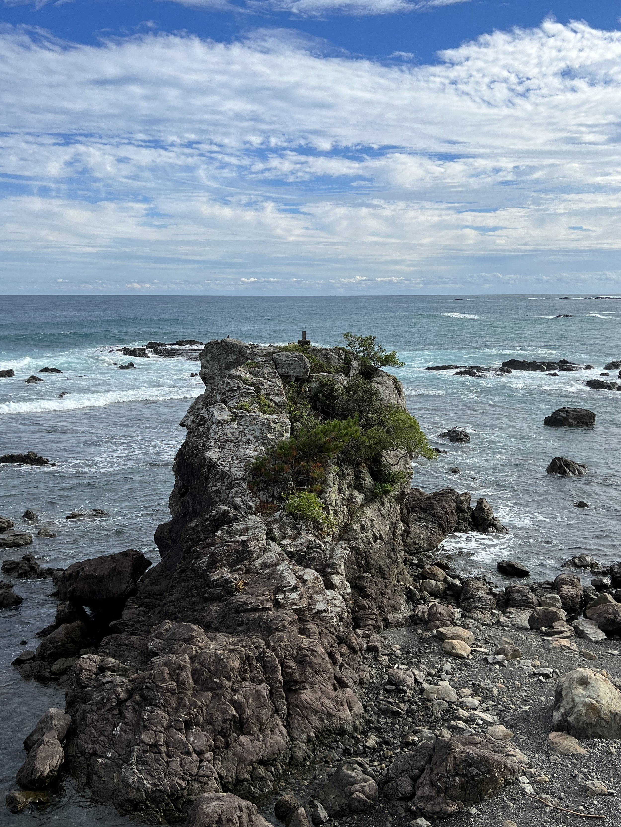 I was flagging a bit this afternoon, when we passed a car parked by the side of the road with its blinkers flashing. no one was in the car, but I happened to look back out to the ocean to see a tall rock standing by itself with a small funeral monument on top. As we came closer, I saw a well-dressed man with a phone in his hand leaving the bottom of the monument and clearly returning to his car after having paid a visit. I don’t know what relation the person memorialized there was to him, but I could feel in the moment that this, too, was a kind of Temple. There are temples between the temples, it seems, at the heart of this pilgrimage.
