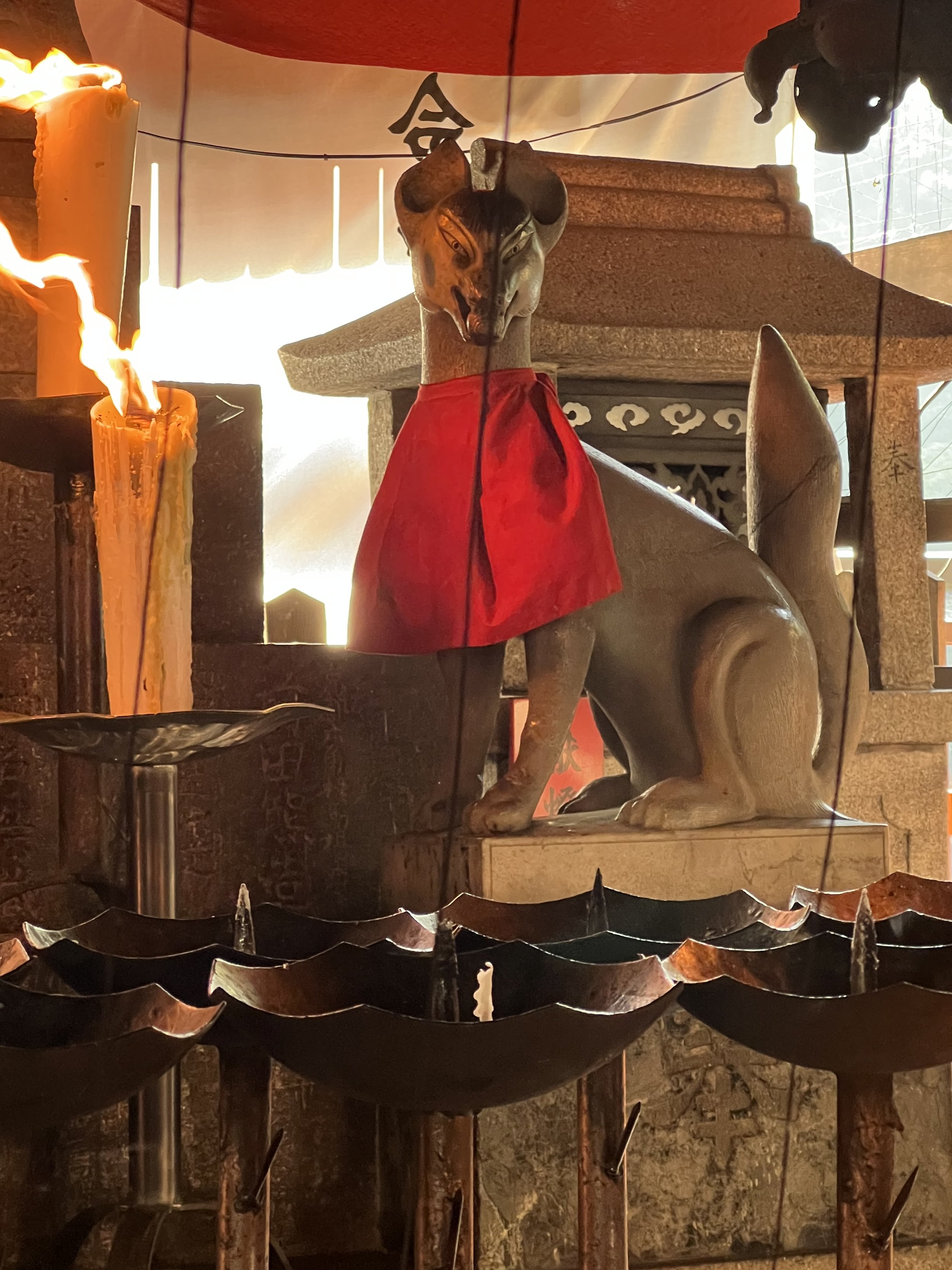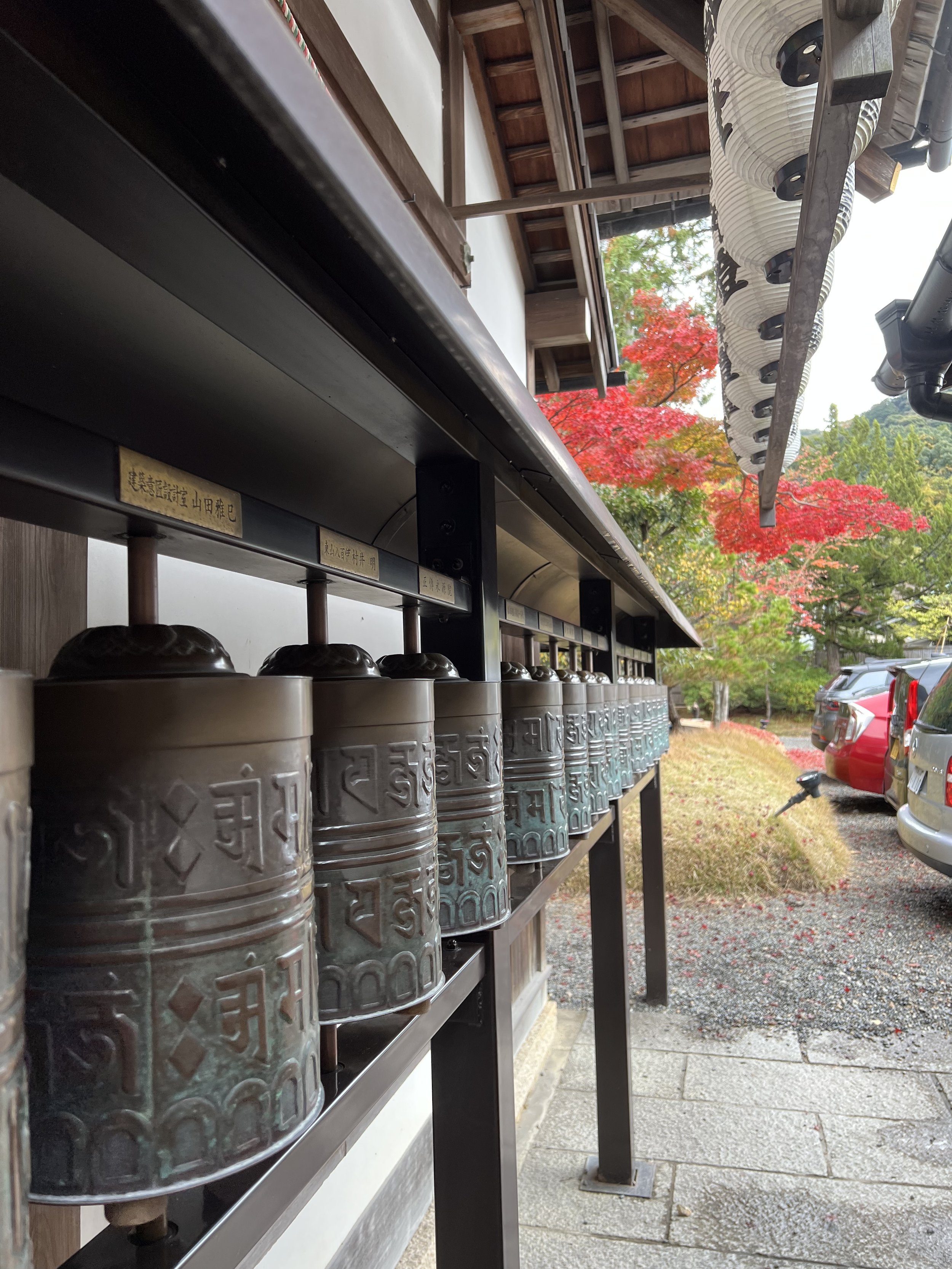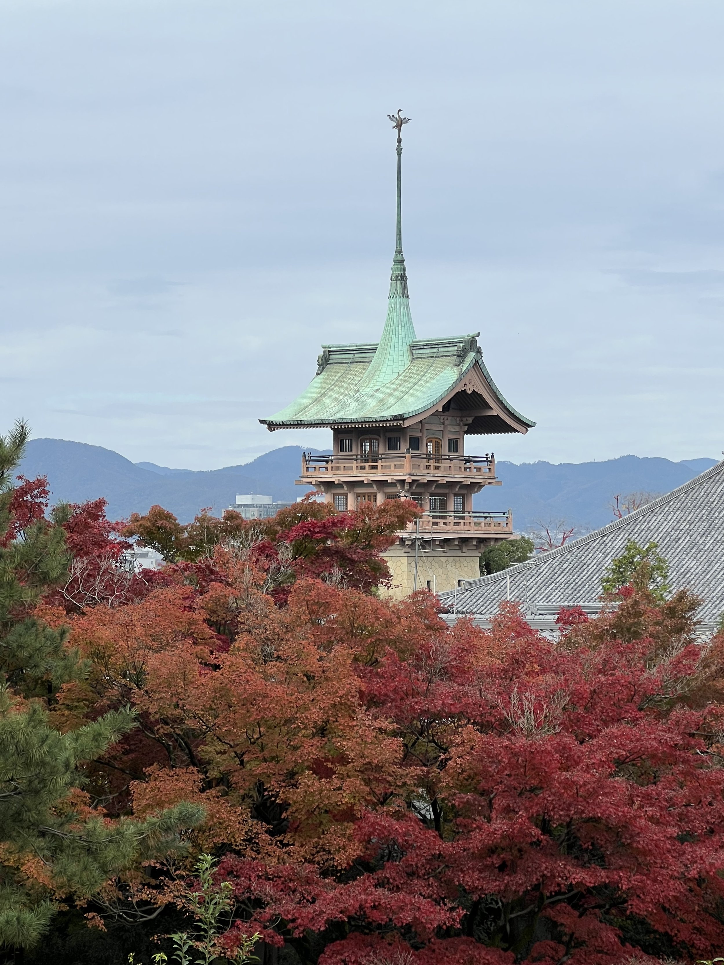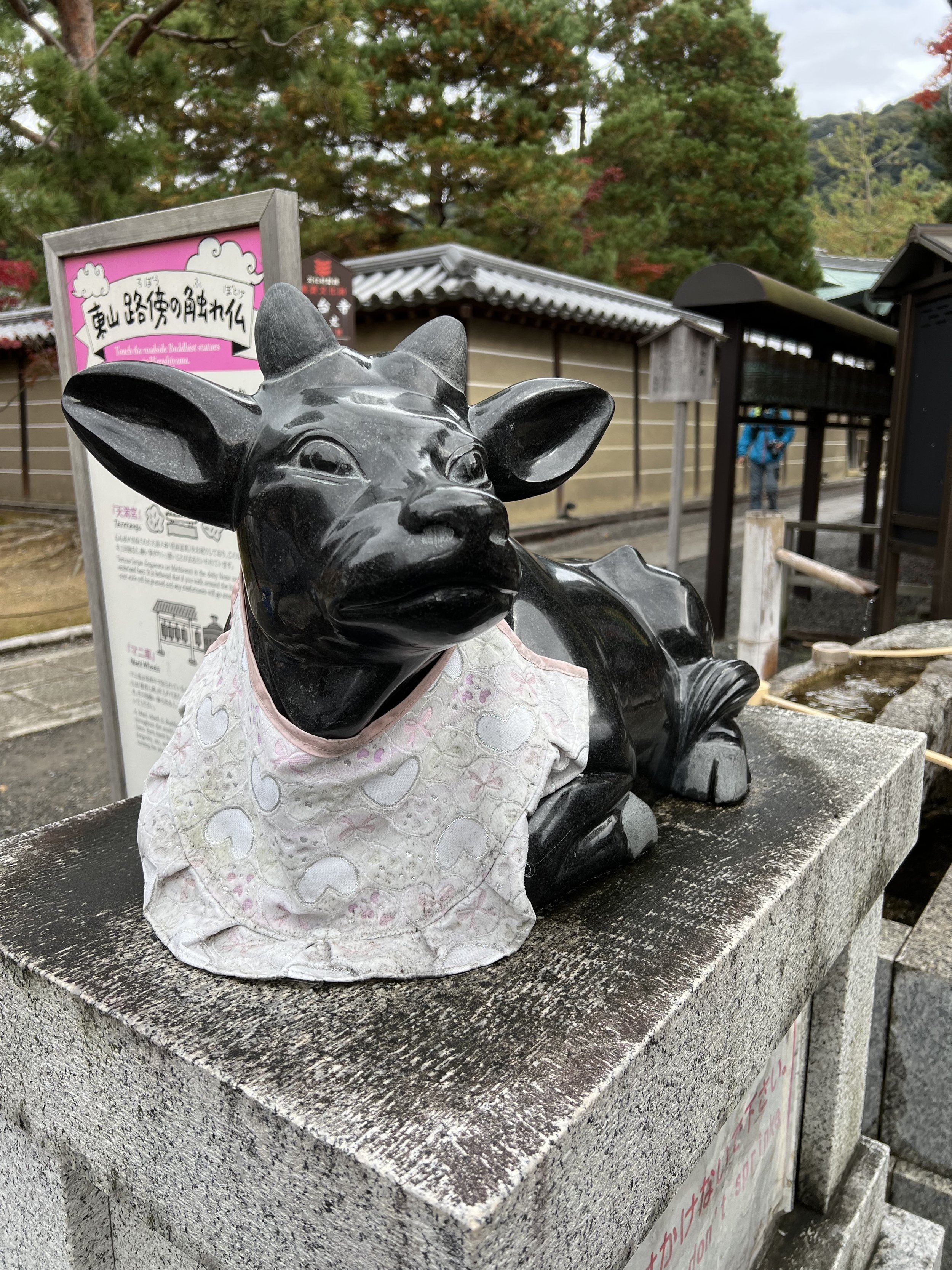 This post will be short on words and long on images. Three days in Kyoto have provided all the medicine my being needed to recover from the rigors of the past few weeks, restore my spirit to and through appreciation and wonder, and perfectly seal this remarkable journey of walking and praying in some of Buddhismโ€™s most beautiful and revered sites. Iโ€™ve visited historic temples, mountain monasteries, and shrines on fire with foliage and the light of millennia of practice. Iโ€™ve walked miles of city streets and forest trails, climbed moss-covered stone steps lined with gates and cedar trees, sat silently in rock gardens, and looked out over the city at sunset in awe. Iโ€™ve danced among dragons and been brought to tears by thousands upon thousands (upon thousands) of foxes. I even found a small temple with prayer wheels near the giant Kannon in the peace garden. Did the Kora three times spinning and prayingโ€”full circle to my time in Ladakh and Nepal. And just outside, a little ox, curled up just like Nandi outside a temple in Southern Indiaโ€”all the way back there to connect with an old friend.